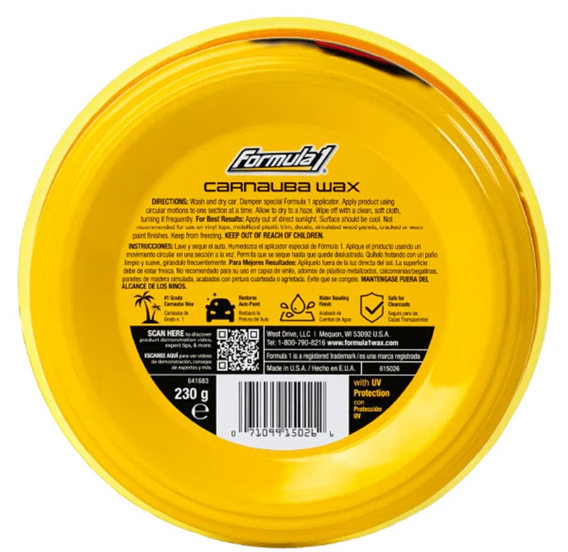 {"id":7142114001028,"title":"Carnauba Wax 230g #1 Grade Brazilian Carnauba Wax for Extended High Gloss Shine 230G","handle":"formula-1-carnauba-paste-wax-230g-shines-protects-reveals-your-cars-true-colour","description":"\u003cp\u003e\u003cspan\u003e\u003cstrong\u003eCarnauba Paste Wax 230g\u003c\/strong\u003e\u003c\/span\u003e\u003c\/p\u003e\n\u003cp\u003e\u003cspan\u003e\u003cstrong\u003ePart Number: 615026\u003c\/strong\u003e\u003c\/span\u003e\u003c\/p\u003e\n\u003cp\u003e\u003cspan\u003e\u003cstrong\u003eBrand: Formula 1\u003c\/strong\u003e\u003c\/span\u003e\u003c\/p\u003e\n\u003cp\u003e\u003cspan\u003eShines, Protects and Reveals Your Car's True Paint Color!\u003c\/span\u003e\u003c\/p\u003e\n\u003cp\u003e\u003cstrong\u003e\u003cspan\u003eDescription\u003c\/span\u003e\u003c\/strong\u003e\u003c\/p\u003e\n\u003cul\u003e\n\u003cli\u003e\u003cspan\u003e#1 Grade Brazilian Carnauba Wax for extended high-gloss shine.\u003c\/span\u003e\u003c\/li\u003e\n\u003cli\u003e\u003cspan\u003eAdvanced micropolishing technology removes minor scratches and haze, revealing the true, rich color of auto paint.\u003c\/span\u003e\u003c\/li\u003e\n\u003cli\u003e\u003cspan\u003eThick, paste formula for concentrated application.\u003c\/span\u003e\u003c\/li\u003e\n\u003cli\u003e\u003cspan\u003eFoam applicator included.\u003c\/span\u003e\u003c\/li\u003e\n\u003cli\u003e\u003cspan\u003eGoes on fast; wipes off easily.\u003c\/span\u003e\u003c\/li\u003e\n\u003c\/ul\u003e\n\u003cp\u003e\u003cspan\u003e\u003cstrong\u003eCar Care Tips\u003c\/strong\u003e\u003c\/span\u003e\u003c\/p\u003e\n\u003cp\u003e\u003cspan\u003eAlways thoroughly wet, wash and dry your car before applying any wax product. We recommend using Formula 1 Wash and Wax to clean your car prior to waxing. If bugs, tar or dirt are an issue, trust Formula 1 Bug \u0026amp; Tar Remover for a deep clean against tough buildup. For alternative, easy wax application, we recommend the Formula 1 Super Pads. To remove excess wax, try the Formula 1 Super Shine Microfiber Polishing Towels.\u003c\/span\u003e\u003c\/p\u003e\n\u003cp\u003e\u003cspan\u003e\u003cstrong\u003eDirections\u003c\/strong\u003e\u003c\/span\u003e\u003c\/p\u003e\n\u003cp\u003e\u003cspan\u003eWash and dry car. Dampen the included Formula 1 foam applicator or Formula 1 Super Pads. Apply product using circular motions, one three-foot section at a time. Allow wax to dry to a haze. Wipe off with a clean, soft cloth, rotating frequently.\u003c\/span\u003e\u003c\/p\u003e","published_at":"2023-07-26T10:33:59+10:00","created_at":"2023-07-26T10:33:59+10:00","vendor":"HPP","type":"","tags":["Car Grooming"],"price":2595,"price_min":2595,"price_max":2595,"available":false,"price_varies":false,"compare_at_price":2995,"compare_at_price_min":2995,"compare_at_price_max":2995,"compare_at_price_varies":false,"variants":[{"id":41530755121284,"title":"Default Title","option1":"Default Title","option2":null,"option3":null,"sku":"615026","requires_shipping":true,"taxable":true,"featured_image":null,"available":false,"name":"Carnauba Wax 230g #1 Grade Brazilian Carnauba Wax for Extended High Gloss Shine 230G","public_title":null,"options":["Default Title"],"price":2595,"weight":500,"compare_at_price":2995,"inventory_management":"shopify","barcode":"071099150266","requires_selling_plan":false,"selling_plan_allocations":[]}],"images":["\/\/myautosupplies.com.au\/cdn\/shop\/files\/615026_A.jpg?v=1769133206","\/\/myautosupplies.com.au\/cdn\/shop\/files\/613762_D_b5d21731-5a18-417c-94b0-a7655517a84a.jpg?v=1769133206","\/\/myautosupplies.com.au\/cdn\/shop\/files\/615026.jpg?v=1769133206","\/\/myautosupplies.com.au\/cdn\/shop\/files\/613762_E_a8bfd696-cc10-426b-8362-541f9588f2ae.jpg?v=1769133206","\/\/myautosupplies.com.au\/cdn\/shop\/files\/613831_B_623d9b0d-cb2b-447e-8062-8e3076214e9d.jpg?v=1769133206","\/\/myautosupplies.com.au\/cdn\/shop\/files\/613831_C_e0e34ff1-4028-4748-a328-0d5049fb0a50.jpg?v=1769133206","\/\/myautosupplies.com.au\/cdn\/shop\/files\/613831_D_a235f4f8-09f8-42ac-add3-28235117b3d5.jpg?v=1769133206","\/\/myautosupplies.com.au\/cdn\/shop\/files\/615026_B.jpg?v=1769133206","\/\/myautosupplies.com.au\/cdn\/shop\/files\/615026_84e65745-f3fa-4fbe-8d04-5de27afd8418.jpg?v=1769133206","\/\/myautosupplies.com.au\/cdn\/shop\/files\/615026A.jpg?v=1769133206","\/\/myautosupplies.com.au\/cdn\/shop\/files\/Formula1_8f51bd62-9174-4145-bf85-6c7595f5289a.jpg?v=1769133206"],"featured_image":"\/\/myautosupplies.com.au\/cdn\/shop\/files\/615026_A.jpg?v=1769133206","options":["Title"],"media":[{"alt":null,"id":51400216576132,"position":1,"preview_image":{"aspect_ratio":1.0,"height":601,"width":601,"src":"\/\/myautosupplies.com.au\/cdn\/shop\/files\/615026_A.jpg?v=1769133206"},"aspect_ratio":1.0,"height":601,"media_type":"image","src":"\/\/myautosupplies.com.au\/cdn\/shop\/files\/615026_A.jpg?v=1769133206","width":601},{"alt":null,"id":51400216477828,"position":2,"preview_image":{"aspect_ratio":1.0,"height":800,"width":800,"src":"\/\/myautosupplies.com.au\/cdn\/shop\/files\/613762_D_b5d21731-5a18-417c-94b0-a7655517a84a.jpg?v=1769133206"},"aspect_ratio":1.0,"height":800,"media_type":"image","src":"\/\/myautosupplies.com.au\/cdn\/shop\/files\/613762_D_b5d21731-5a18-417c-94b0-a7655517a84a.jpg?v=1769133206","width":800},{"alt":null,"id":25363551223940,"position":3,"preview_image":{"aspect_ratio":1.0,"height":800,"width":800,"src":"\/\/myautosupplies.com.au\/cdn\/shop\/files\/615026.jpg?v=1769133206"},"aspect_ratio":1.0,"height":800,"media_type":"image","src":"\/\/myautosupplies.com.au\/cdn\/shop\/files\/615026.jpg?v=1769133206","width":800},{"alt":null,"id":51400216641668,"position":4,"preview_image":{"aspect_ratio":1.0,"height":800,"width":800,"src":"\/\/myautosupplies.com.au\/cdn\/shop\/files\/613762_E_a8bfd696-cc10-426b-8362-541f9588f2ae.jpg?v=1769133206"},"aspect_ratio":1.0,"height":800,"media_type":"image","src":"\/\/myautosupplies.com.au\/cdn\/shop\/files\/613762_E_a8bfd696-cc10-426b-8362-541f9588f2ae.jpg?v=1769133206","width":800}